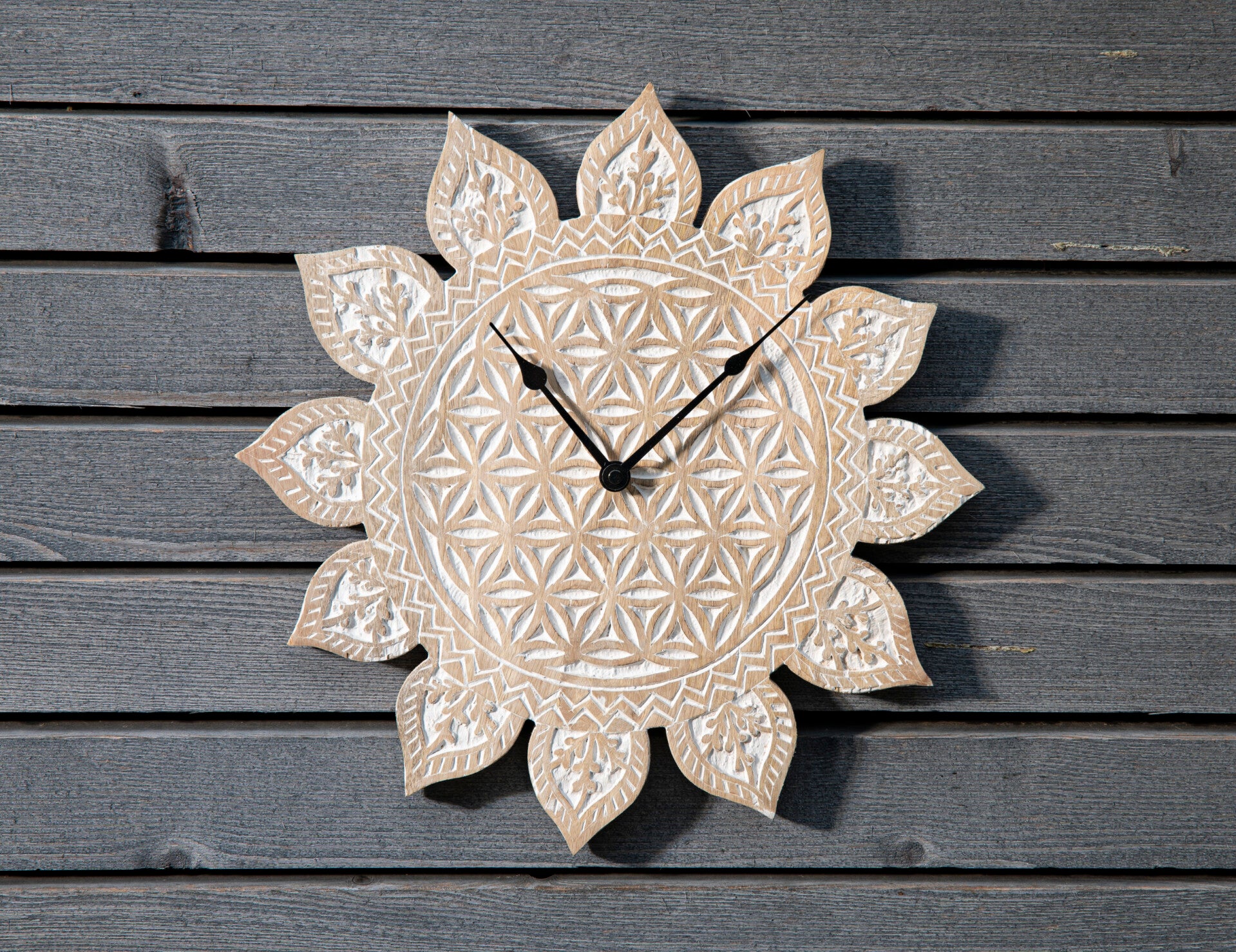 Eine außergewöhnliche Wanduhr aus Mangoholz mit von Hand geschnitzter Lebensblume.